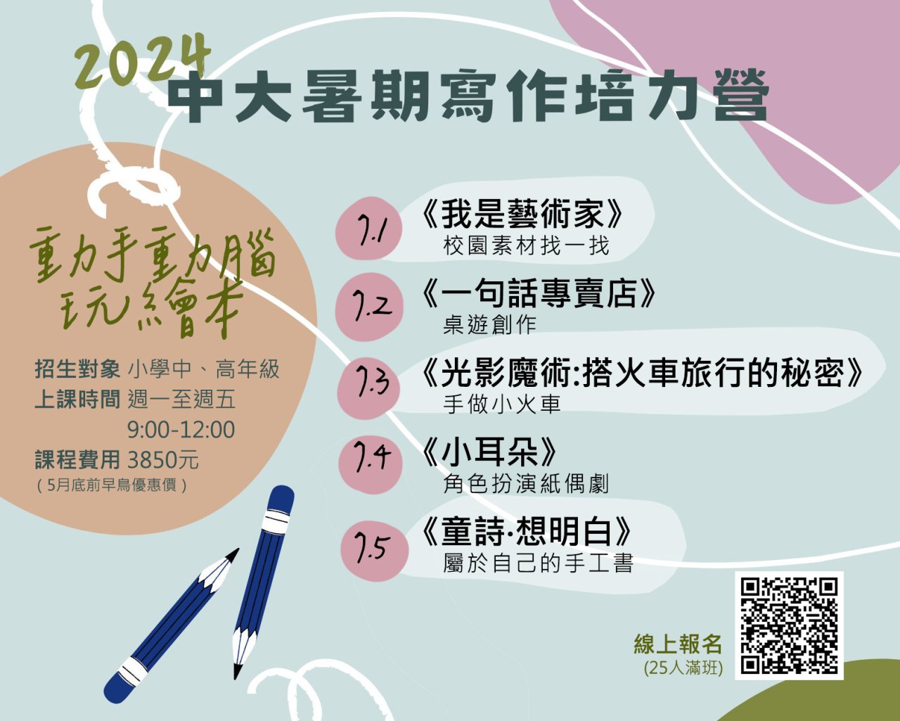 一、為提升孩子競爭力,國立中央大學特聘專長領域師資,設計由淺入深的寫作培力半日營隊,以重視實作演練的工作坊形式,訓練孩子將生活與閱讀的經驗轉化成寫作上的表現力。
