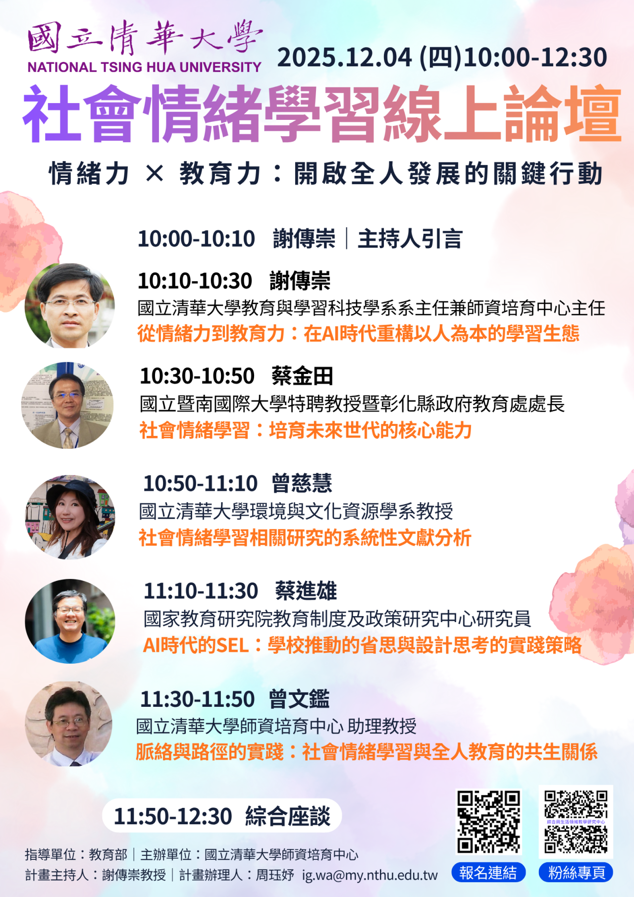 國立清華大學辦理「社會情緒學習線上論壇-情緒力 × 教育力:開啟全人發展的關鍵行動」線上論壇
