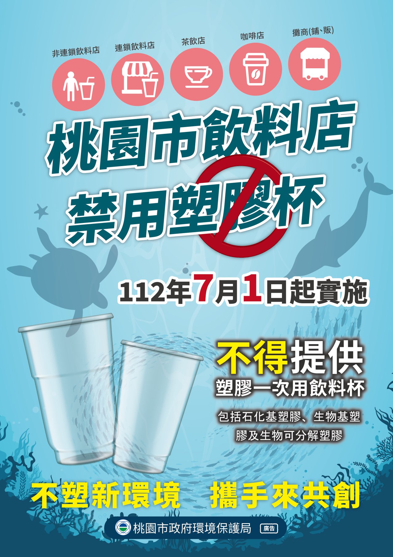 主旨: | 本市飲料店自112年7月1日起不得提供塑膠一次用飲料杯政策,敬請貴單位協助宣導,請查照。 |