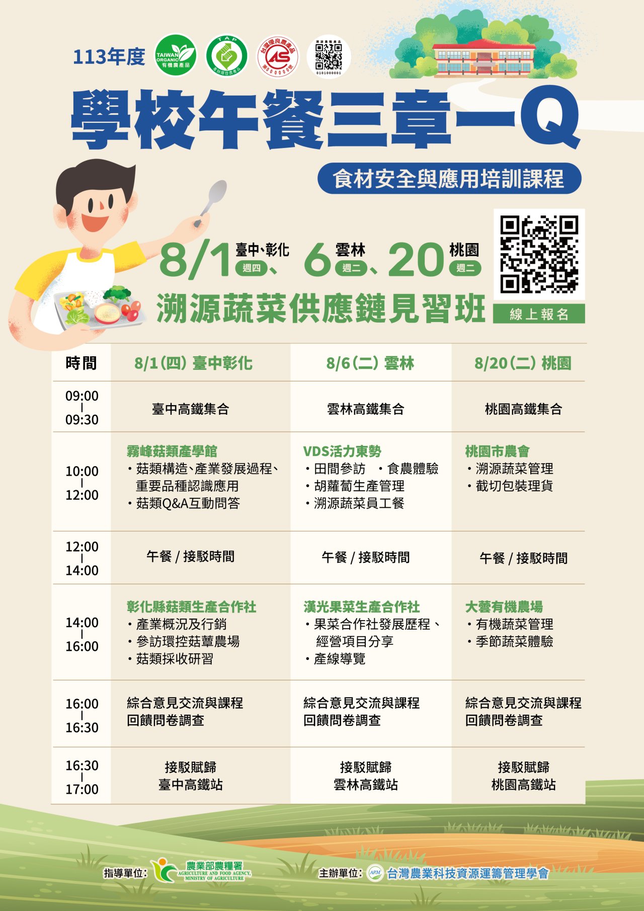 | 二、 | 為增進學校午餐行政工作人員及廠商有關三章一Q驗收辨識與食材應用知能,爰分區辦理課程活動,期增加相關從業人員對溯源食材專業知識,提升學校午餐驗收作業正確性;另為提升學員對於蔬菜食農教育教學及蔬菜食材供應鏈體系概念,本年度課程規劃赴產地見習,透過與農產品經營者交流互動,提升對溯源蔬菜產業資訊與季節產品知識。 |