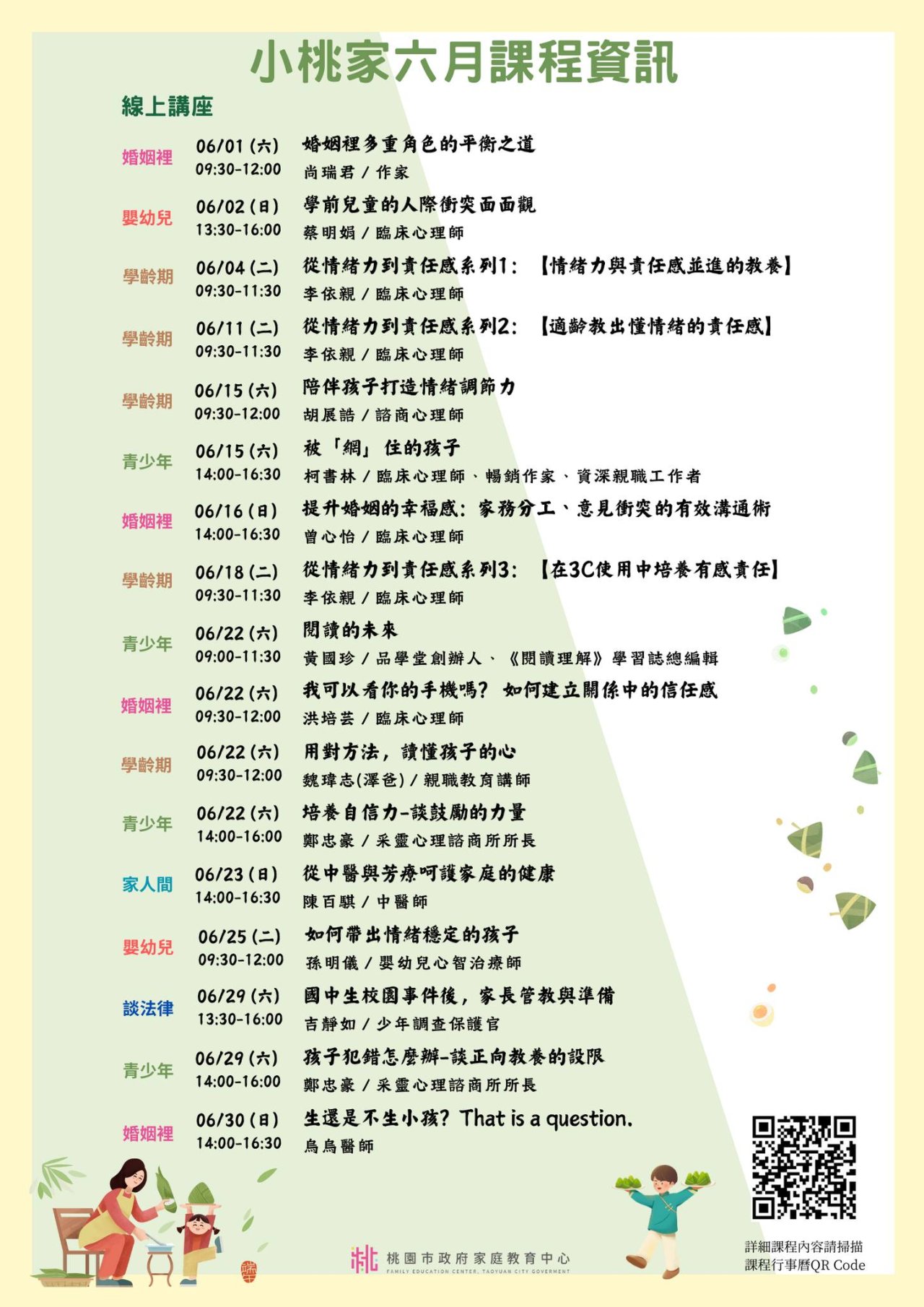 二、 | 旨揭課程詳細資訊,請見中心課程行事曆(https://reurl.cc/xlGyGL)或追蹤「桃園市政府家庭教育中心」FB粉絲專頁;另倘有家庭教育個別化服務需求,可撥打4128185諮詢專線或申請小桃家線上諮詢室(https://reurl.cc/oZWOY5)服務。 |