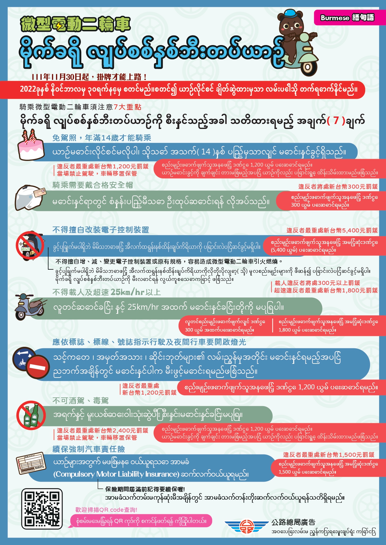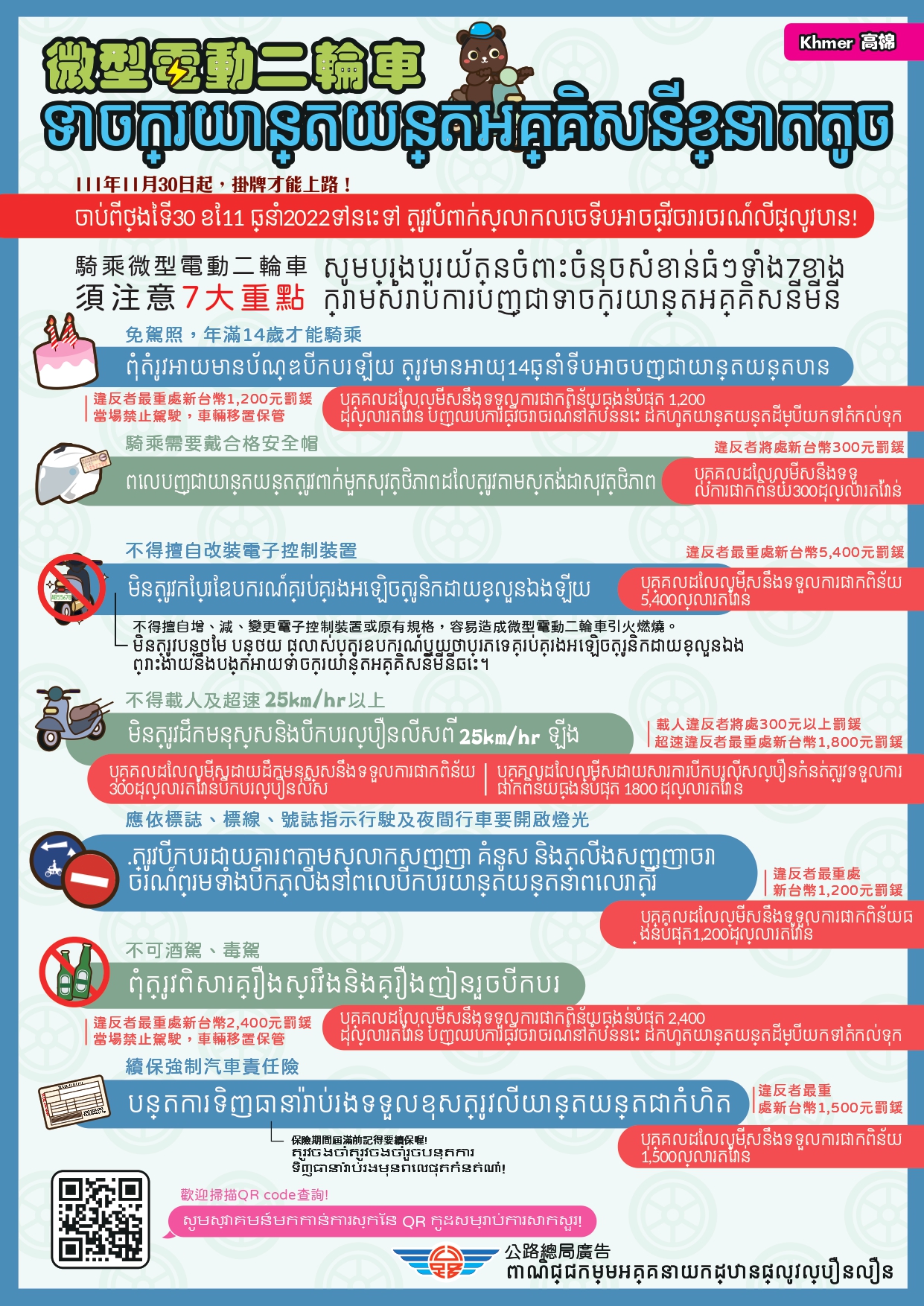 | 請貴校協助宣導,使用中微型電動二輪車於111年11月30日起至113年11月29日止,2年內依規定至各地公路監理機關或到點服務辦理微電車實車查核、領用、懸掛牌照,微電車牌照規費:號牌1面300元、行照1枚150元(111年11月30日起至112年12月31日止辦理「使用中」微型電動二輪車領牌登記,免徵規費450元),騎乘微電車應遵守以下規定: |