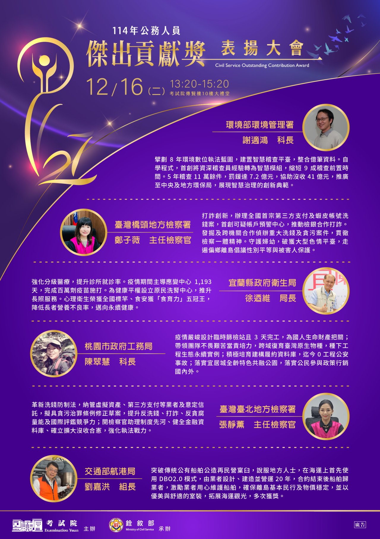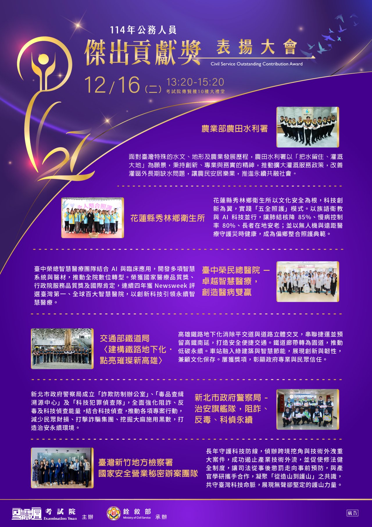 | 主旨: | 有關「114年公務人員傑出貢獻獎表揚大會」電子海報,請查照並協助公告。 |